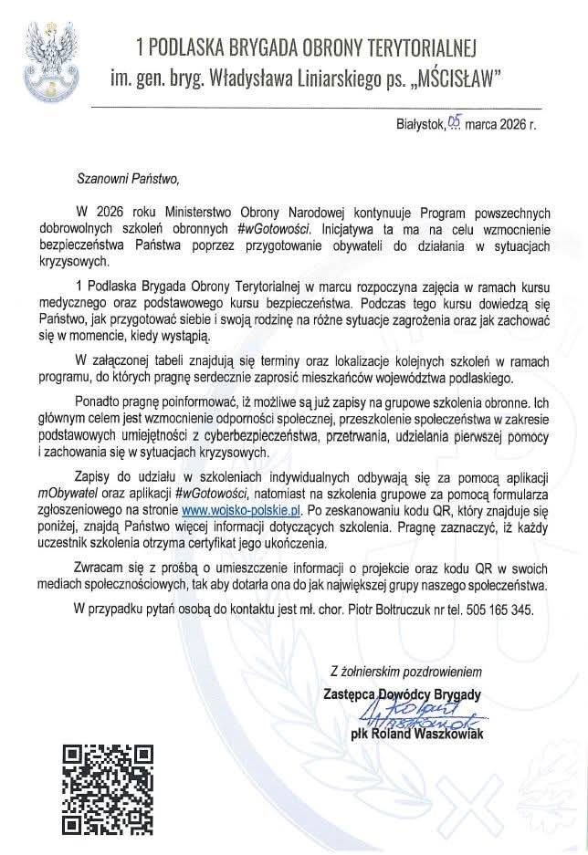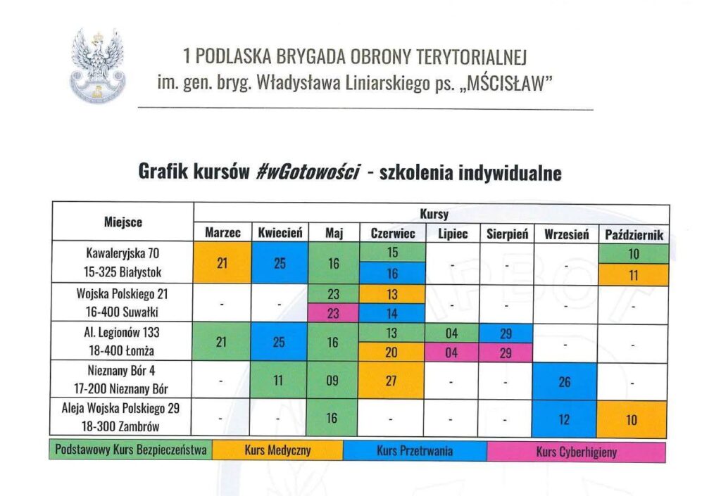 Informacja o szkoleniach obronnych #wGotowości organizowanych przez 1 Podlaska Brygada Obrony Terytorialnej . Zachęcamy do zapoznania się o kursach grupowych z harmonogramem szkoleń.